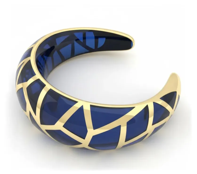 A beautiful Parissart Crawford Blue Waves of Electricity Sapphire and Gold Bracelet. This resin filled bracelet features a unique design waving through the piece. The Waves of Electricity design encapsulates the shocking. Wear this bracelet to have fun and draw eyes! Made of: resin filled and 18k gold solid. Measurements: Length: 27.2 inches. Width: 0.8 inches. All Paris' Art jewelry at Setty Gallery comes to you in an original P.A. Crawford gift box.
