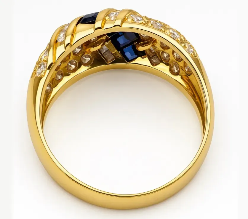 Fred Paris 18K Yellow Gold Diamond Bleu Sapphire Princess Cut Dome Pave Ring