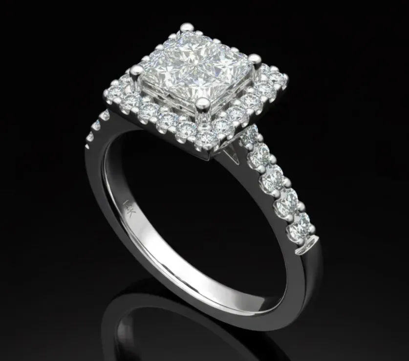 GCA Halo 14k White Gold Cluster Princess and Round Diamond Engagement Ring