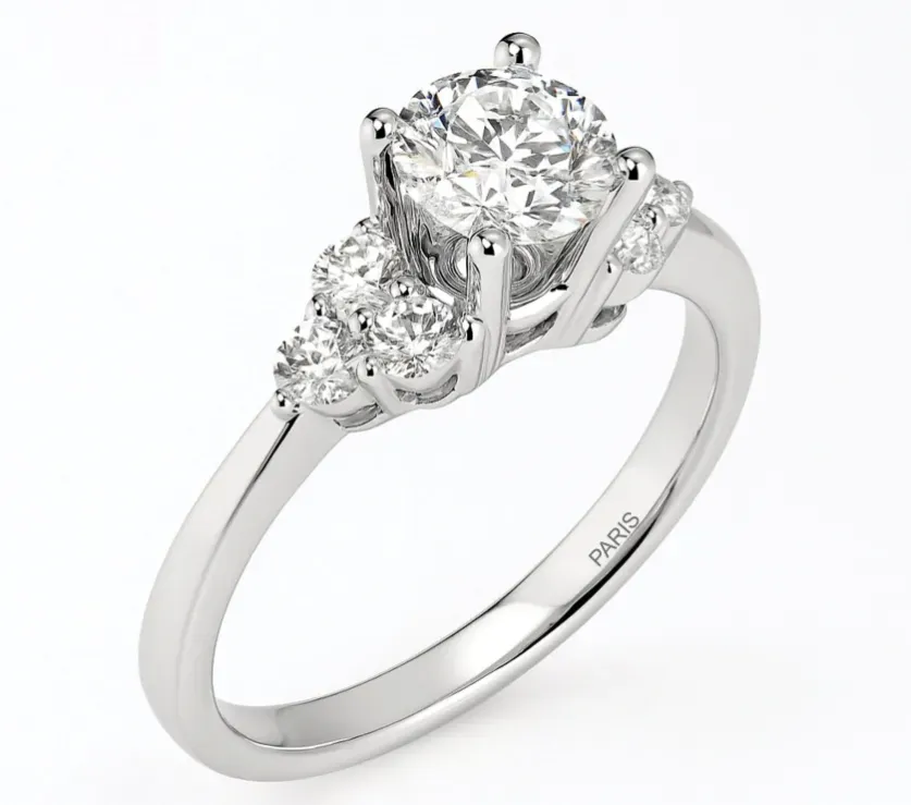 From our engagement ring collection, define your style with this unique engagement ring. A single classic brilliant-cut GF VVS diamond brightly shimmers accented by a trilogy of diamonds on each side, all set in 14-karat white gold.